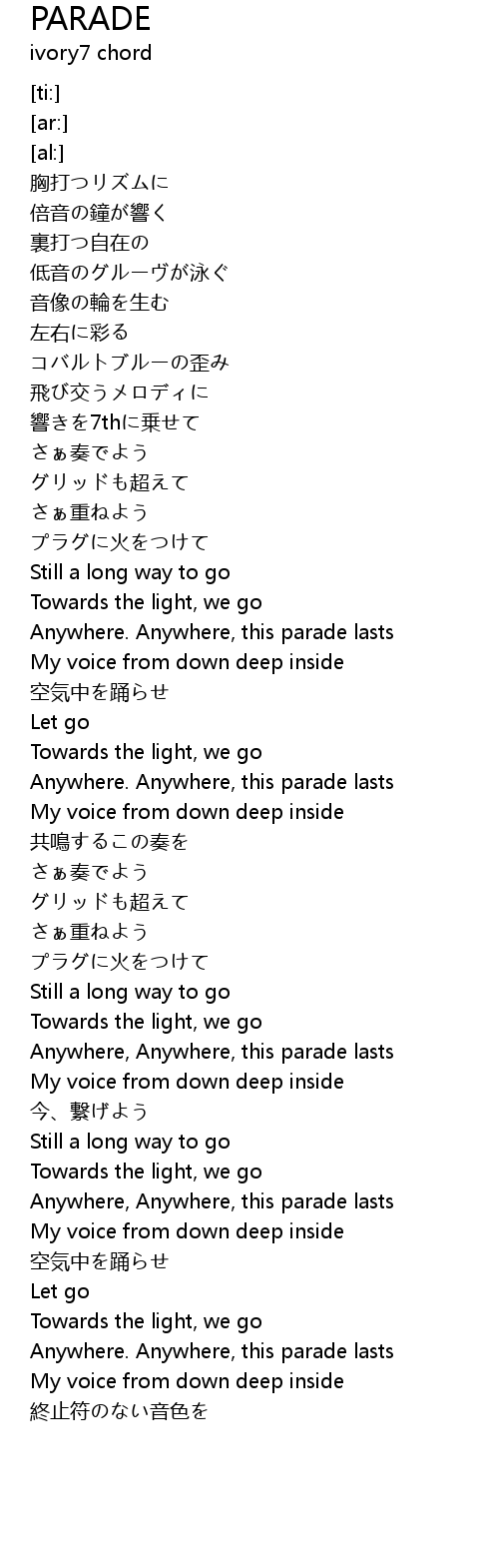 | [02:24.52] | Anywhere, Anywhere, this parade lasts |