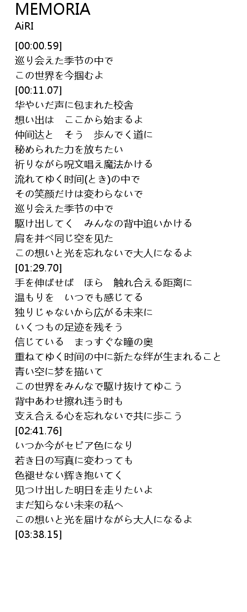 | [03:29.04] | この想いと光を届けながら大人になるよ |