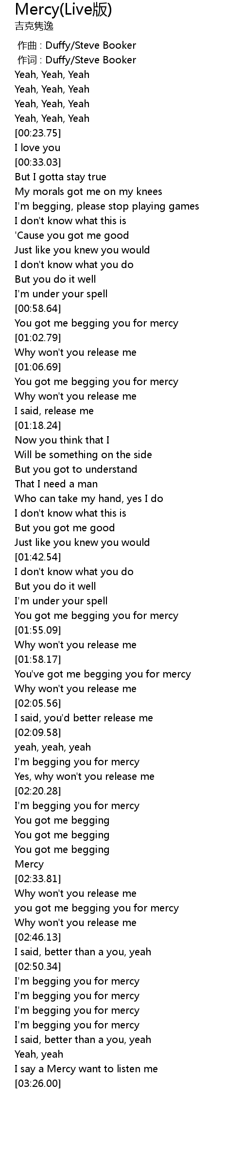 | [02:22.59] | I'm begging you for mercy |