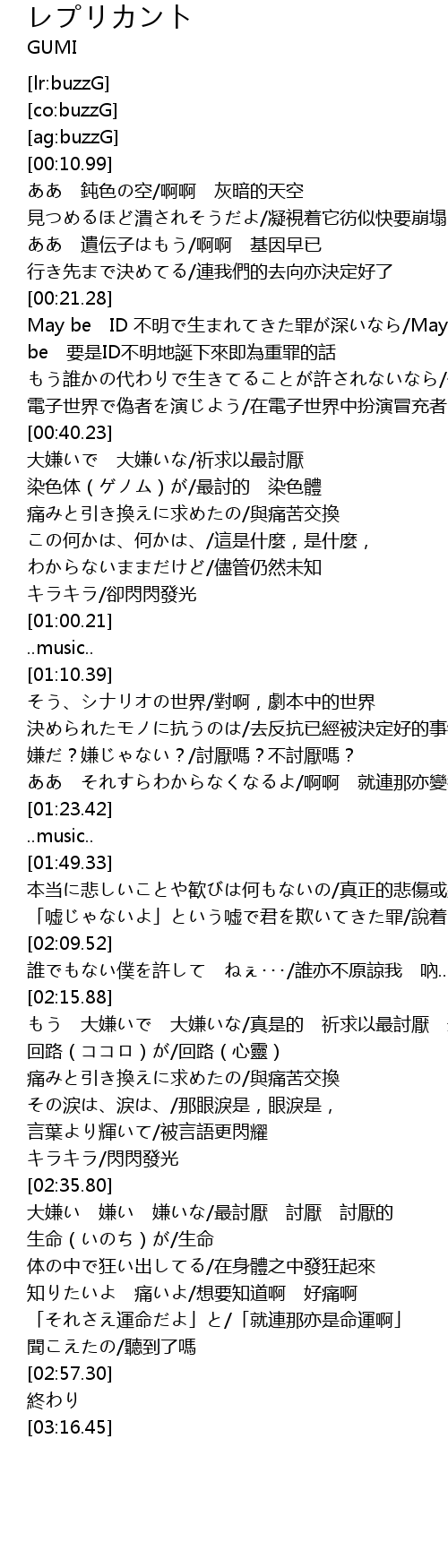 | [00:16.61] | ああ 遺伝子はもう/啊啊 基因早已 |