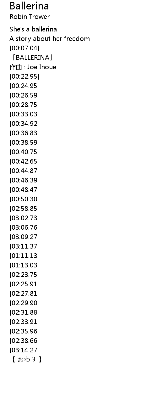 | [03:15.40][02:58.85][01:51.51][00:56.03] | She' s a ballerina |