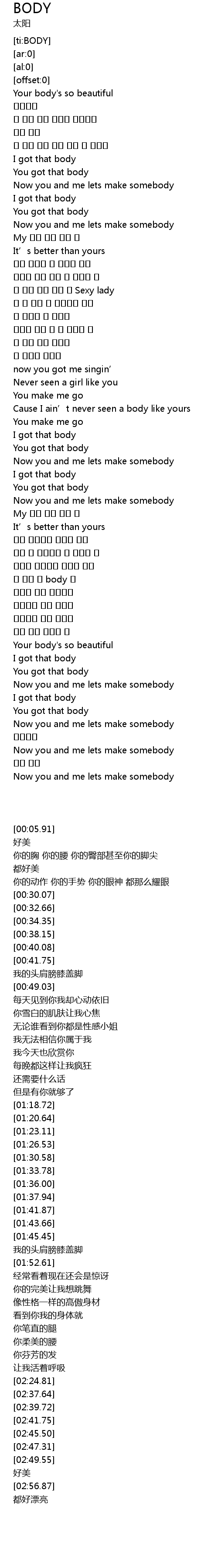 | [01:26.53] | Cause I ain' t never seen a body like yours |