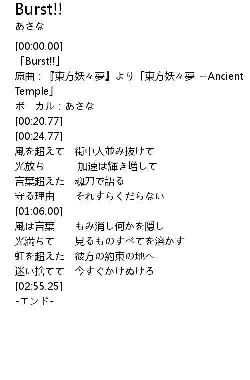 | [00:00.77] | 「Burst!!」 |