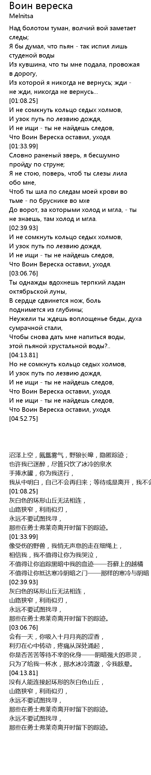 | [02:20.87] | Чтоб ты шла по следам моей крови во тьме - по бруснике во мхе |