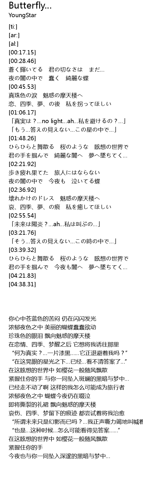 | [00:38.18] | 夜の闇の中で 蠢く 綺麗な蝶 |