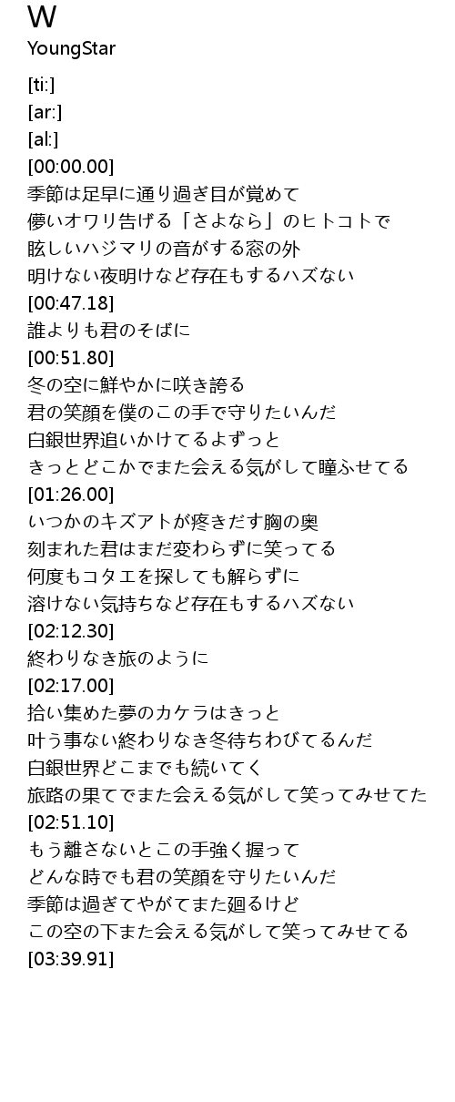| [02:26.14] | 叶う事ない終わりなき冬待ちわびてるんだ |
