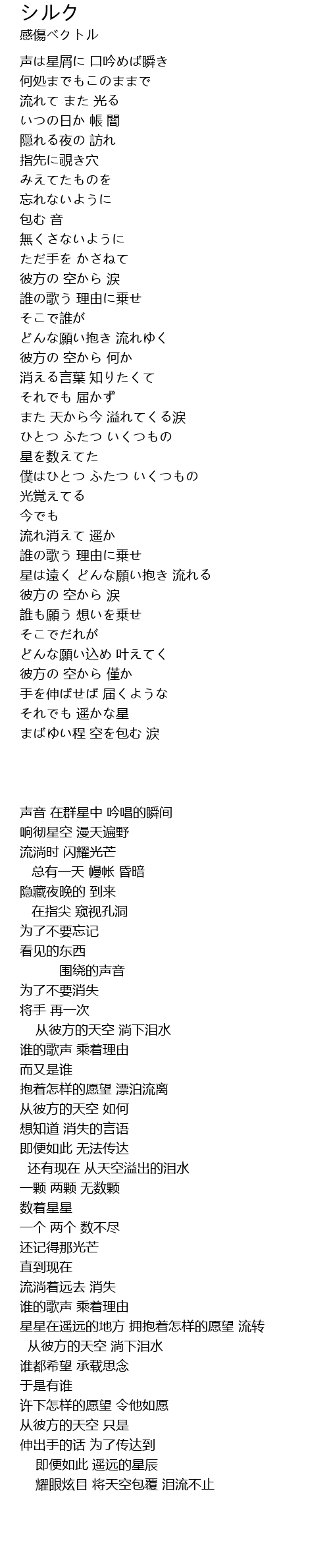 | [00:22.56] | 声は星屑に 口吟めば瞬き |