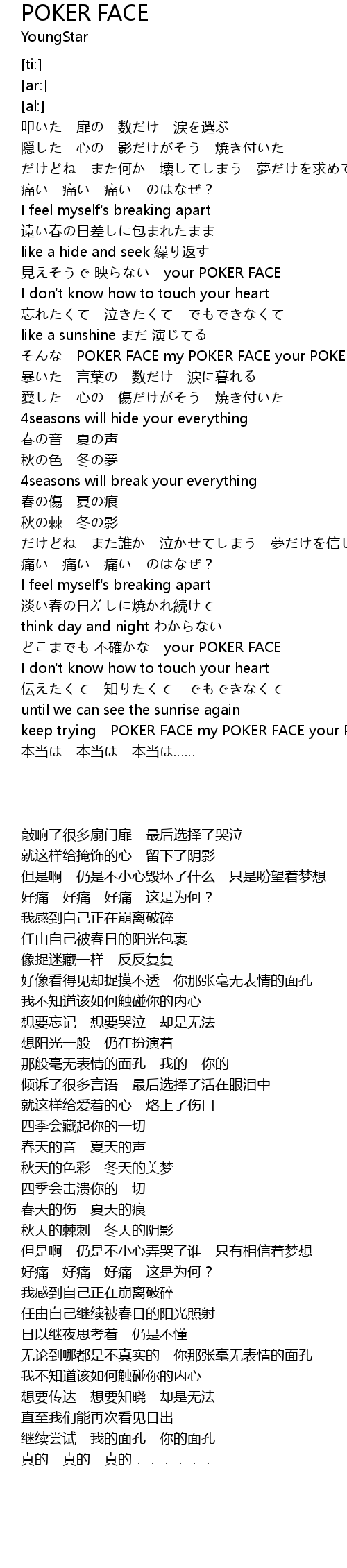 | [02:24.35] | POKER FACE my POKER FACE your POKER FACE |
