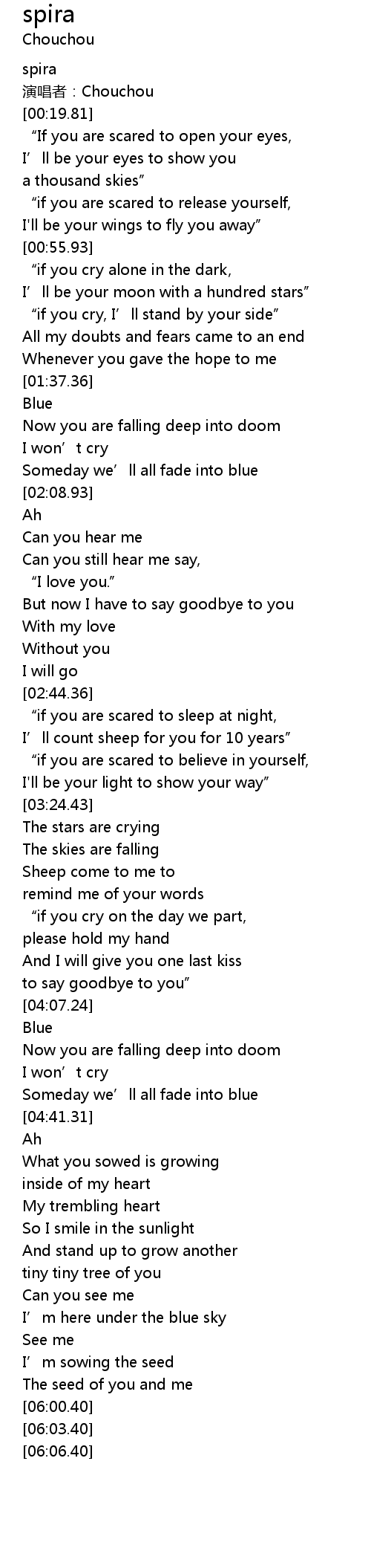 | [00:23.29] | “If you are scared to open your eyes, |