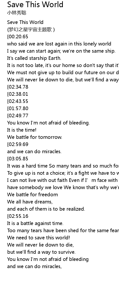| [01:14.66][03:05.85] | so take my hand, we need to save this world! |