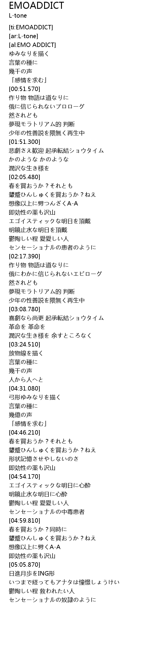 | [01:48.100] | 少年の性善説を隈無く再生中 |