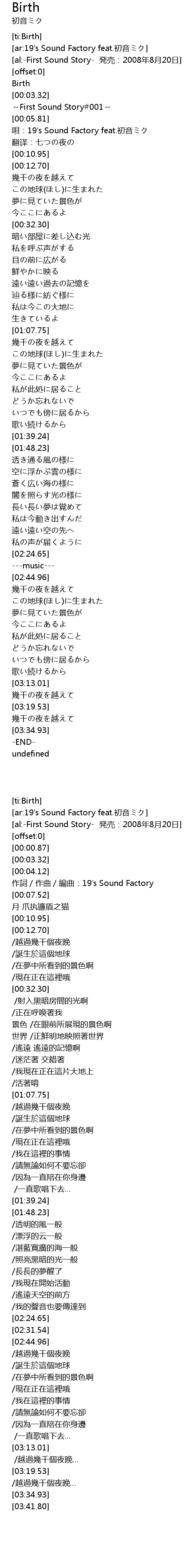 | [00:07.52] | 唄:19's Sound Factory feat.初音ミク |