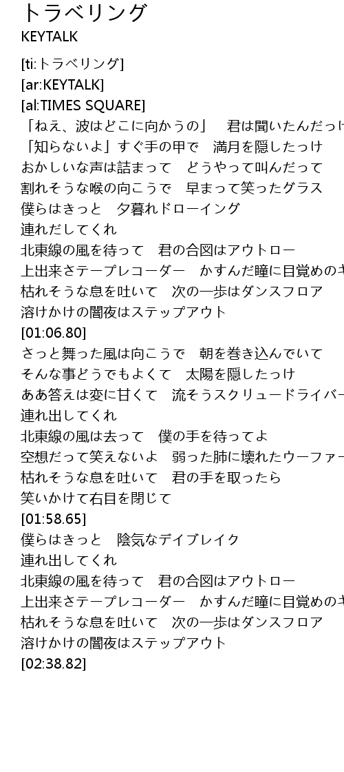 | [02:18.23] | 北東線の風を待って 君の合図はアウトロー |