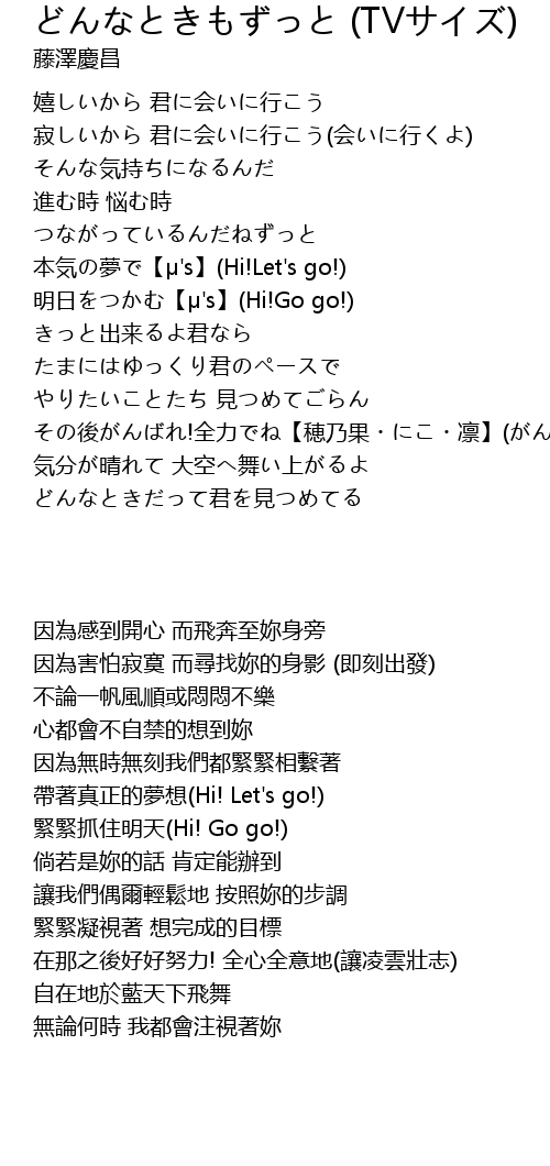 | [00:34.220] | 本気の夢で【μ's】(Hi!Let's go!) |