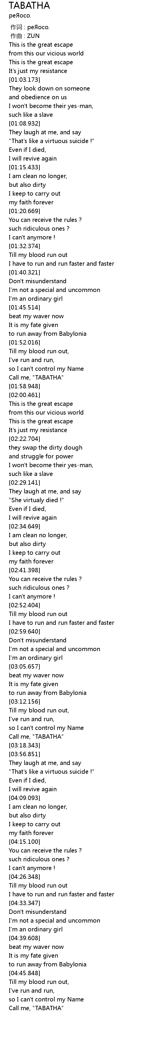 | [03:16.850] | Call me, "TABATHA" |