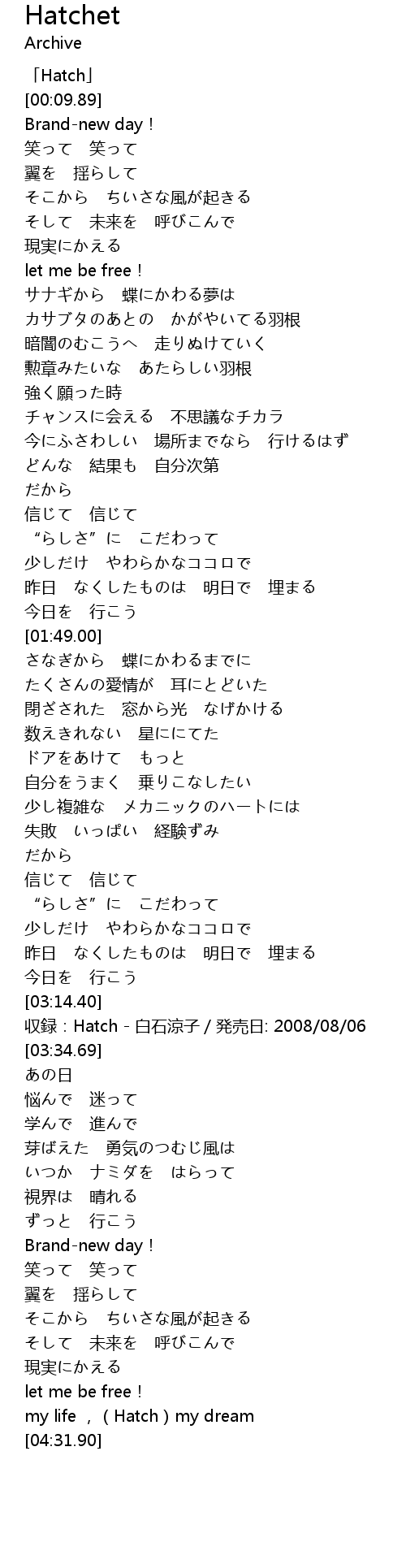 | [03:17.69] | 収録:Hatch - 白石涼子/発売日: 2008/08/06 |