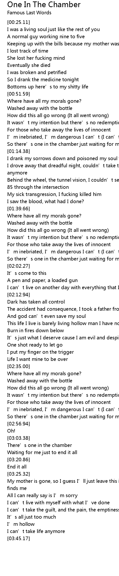 | [02:52.94] | So there’s one in the chamber just waiting for me to end it all |