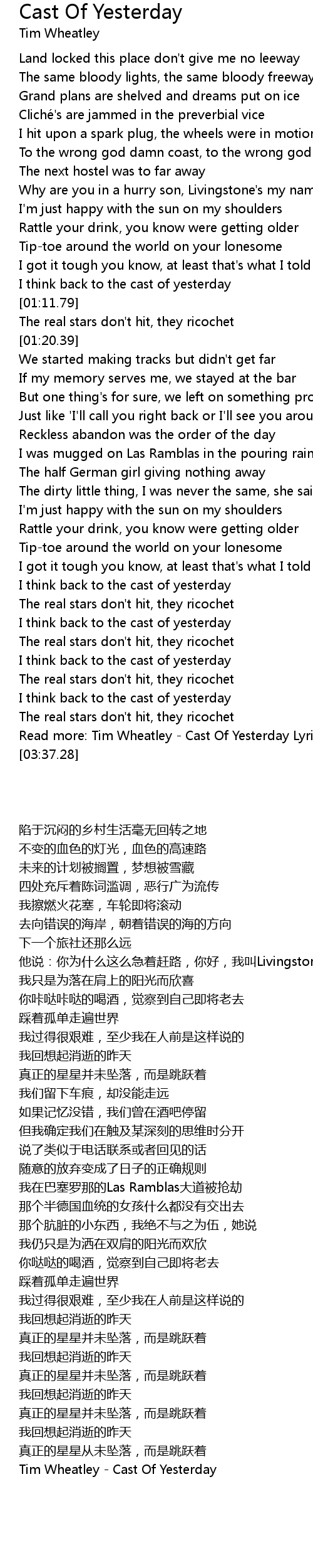 | [03:33.00] | Read more: Tim Wheatley - Cast Of Yesterday Lyrics | MetroLyrics |