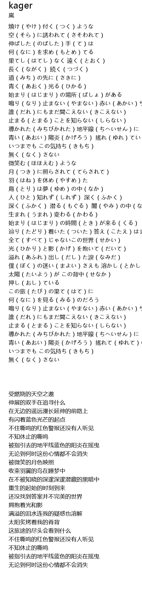 | [00:37.570] | 青く(あおく)光る(ひかる) 始まり(はじまり)の場所(ばしょ)がある |