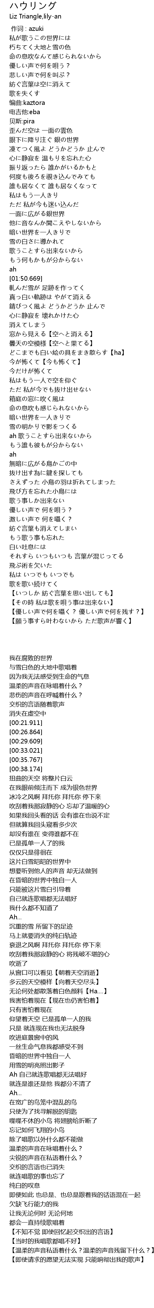 | [02:21.448] | どこまでも白い絵の具をまき散らす【ha】 |