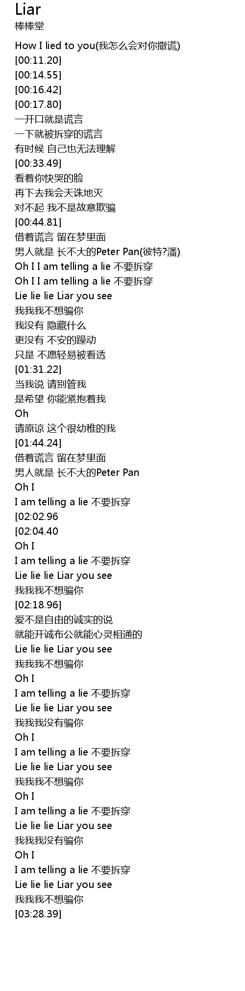 | [03:18.89] | I am telling a lie 不要拆穿 |