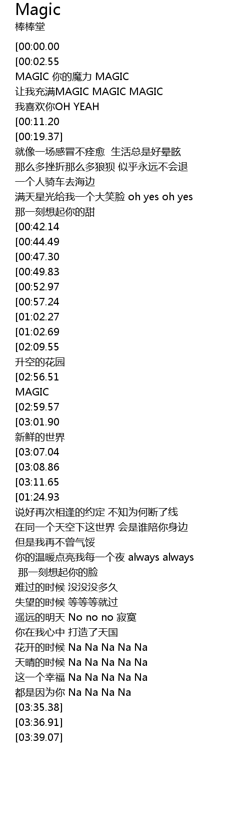 | [03:17.69][02:56.51][02:14.29][01:08.19] | MAGIC 当我听见 MAGIC 你悄悄说 MAGIC |