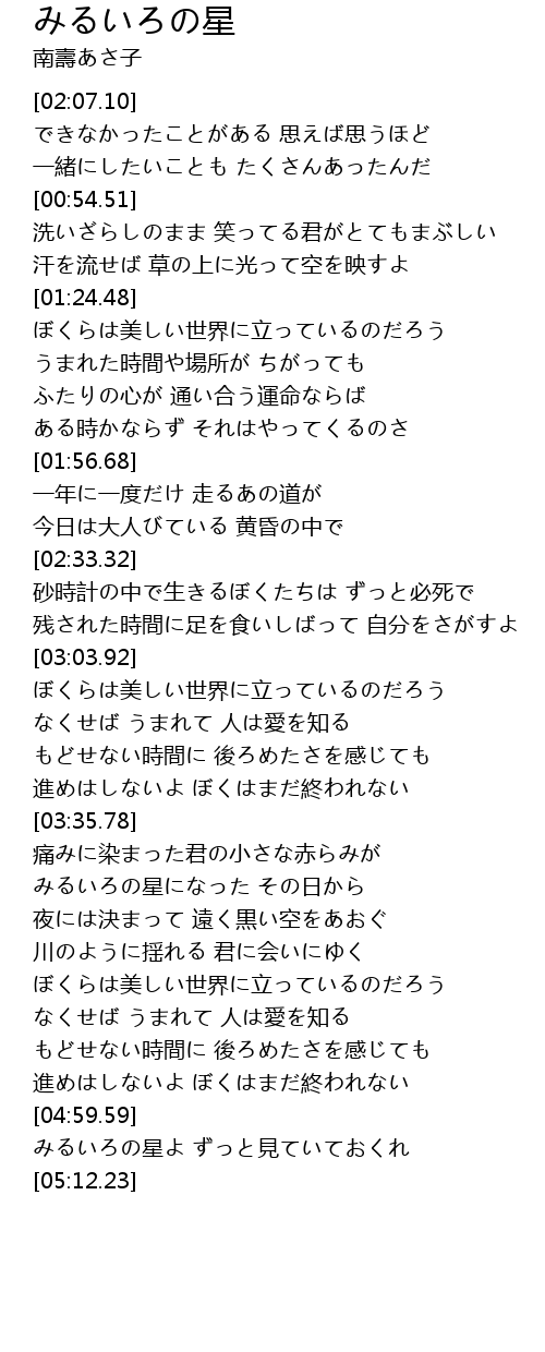 | [05:01.18] | みるいろの星よ ずっと見ていておくれ |