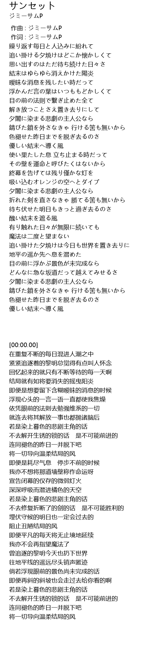 | [00:29.64] | 追い掛ける夕焼けはどこか懐かしくて |