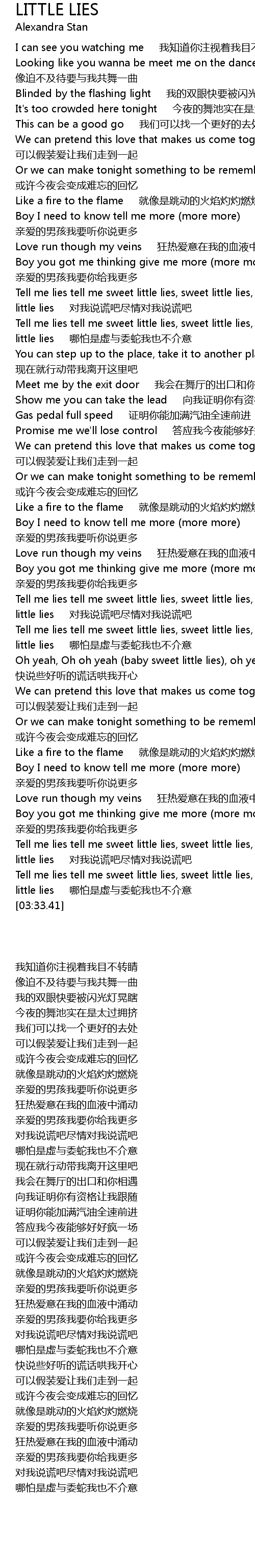 | [03:23.33] | Tell me lies tell me sweet little lies, sweet little lies, sweet little lies na pa shi xu yu wei yi wo ye bu jie yi |