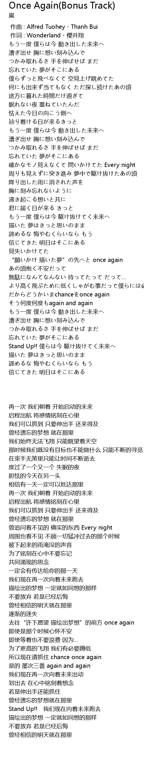 | [03:30.56] | Stand Up!! pú jīn qū bá wèi lái |