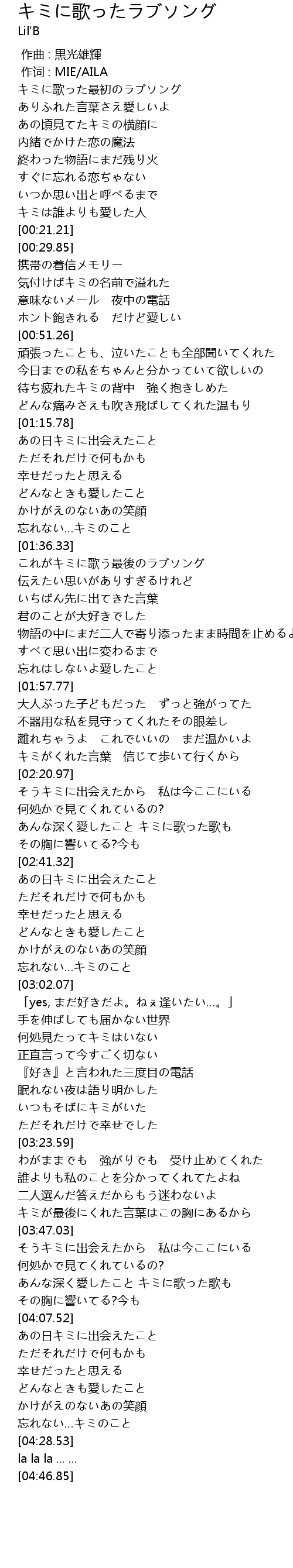 | [02:13.29] | キミがくれた言葉 信じて歩いて行くから |