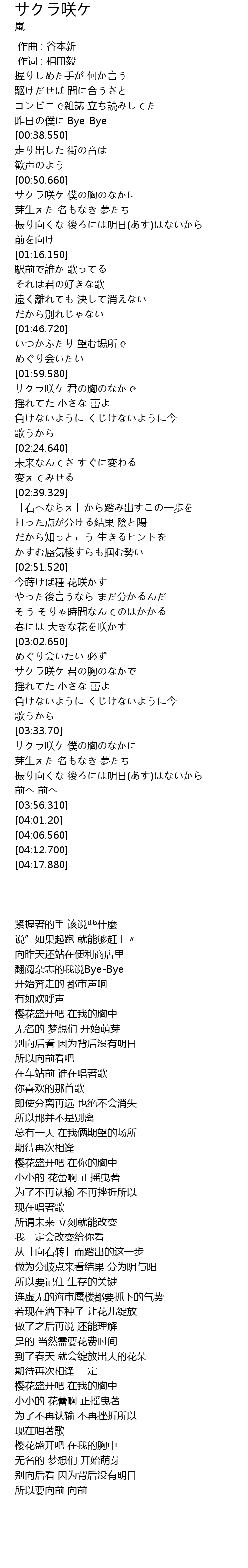 | [03:33.690] | サクラ咲ケ 僕の胸のなかに |