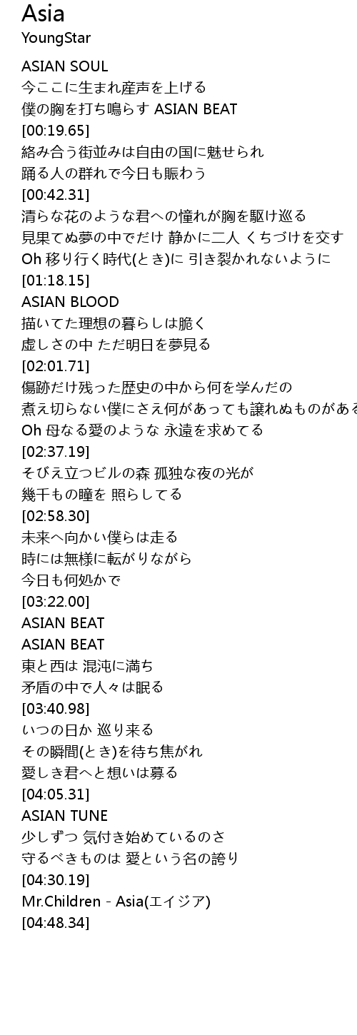 | [04:39.76] | Mr.Children - Asia(エイジア) |