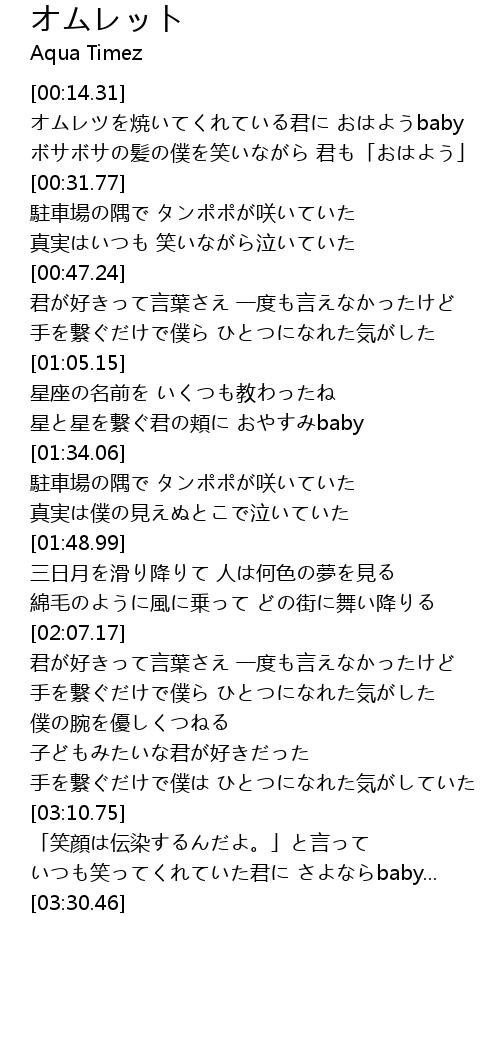 | [00:15.76] | オムレツを焼いてくれている君に おはようbaby |