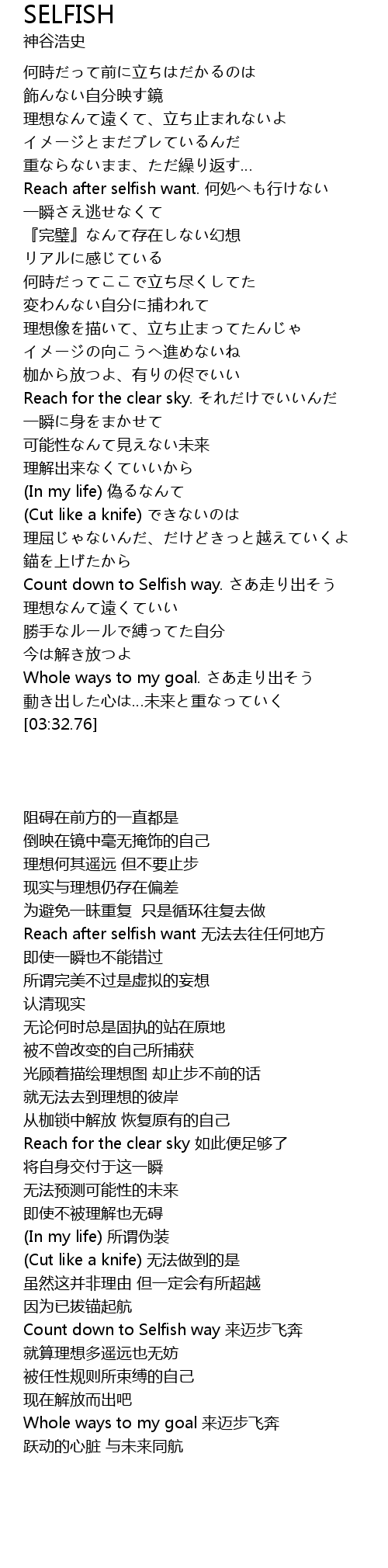 | [02:51.47] | Count down to Selfish way. さあ走り出そう |