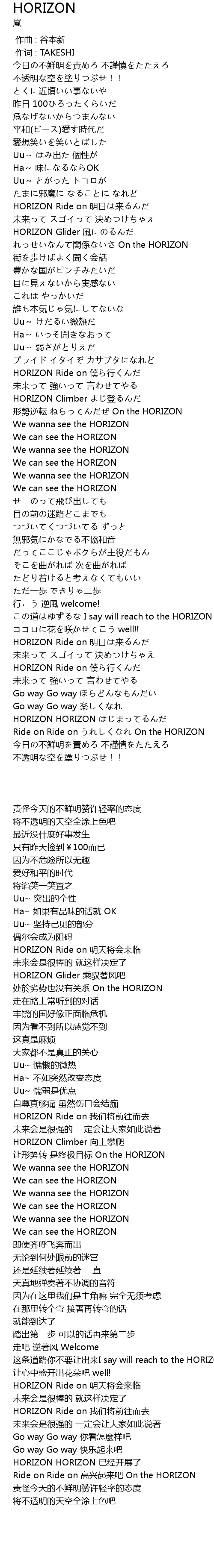| [03:59.44] | HORIZON Ride on 僕ら行くんだ |