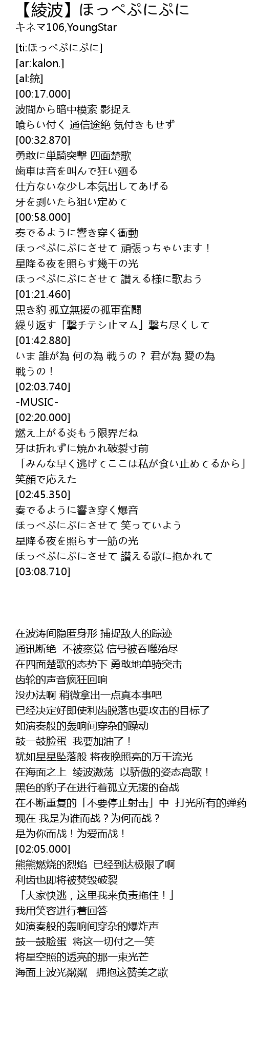 | [01:15.820] | ほっぺぷにぷにさせて 讃える様に歌おう |