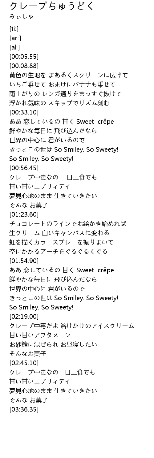 | [00:33.35] | ああ 恋しているの 甘く Sweet crêpe |