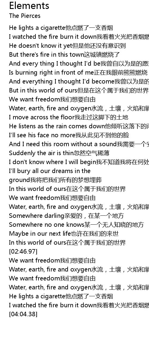 | [01:59.35] | Water, earth, fire and oxygen水流,土壤,火焰和氧气 |
