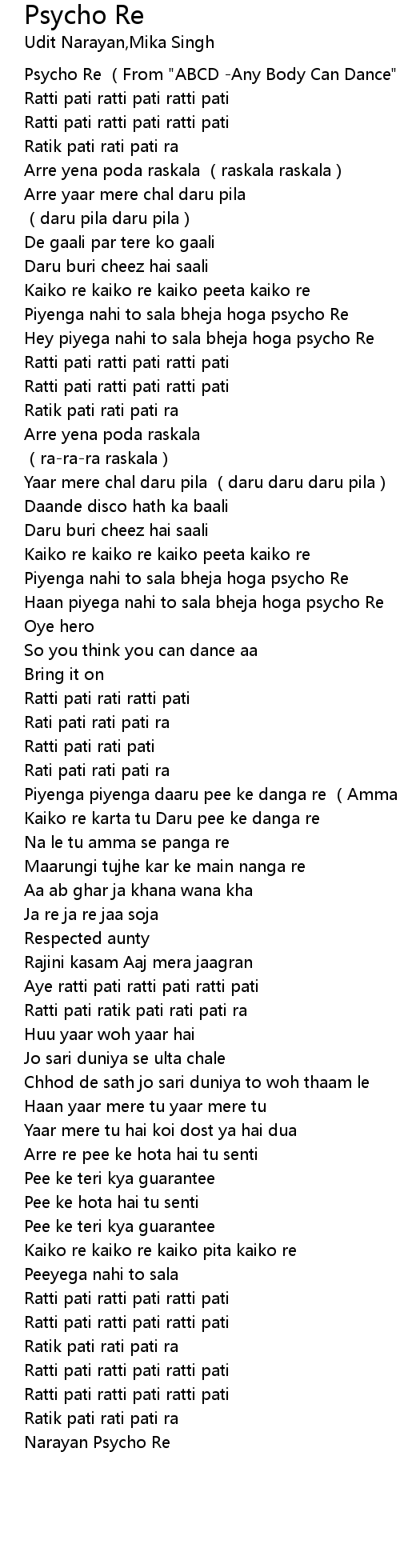 | [00:00.870] | Psycho Re (From "ABCD -Any Body Can Dance")-Udit Narayan |