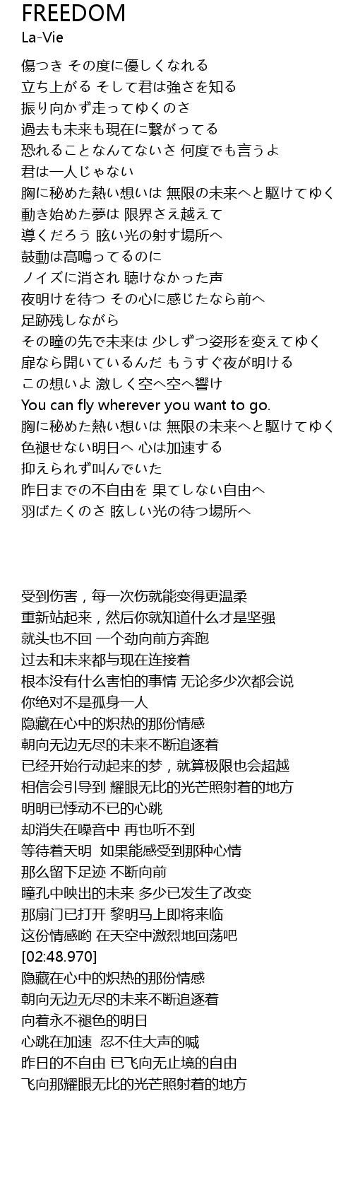 | [03:05.810] | 昨日的不自由 已飞向无止境的自由 |