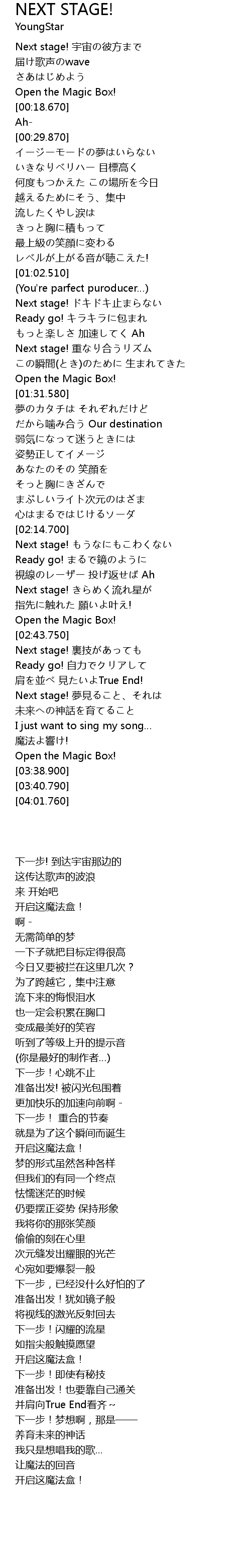 | [01:04.660] | Next stage! ドキドキ止まらない |