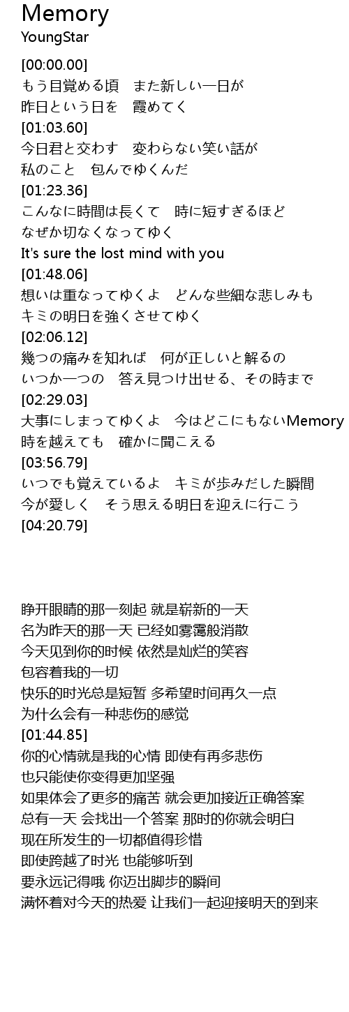 | [03:38.86] | 大事にしまってゆくよ 今はどこにもないMemory |