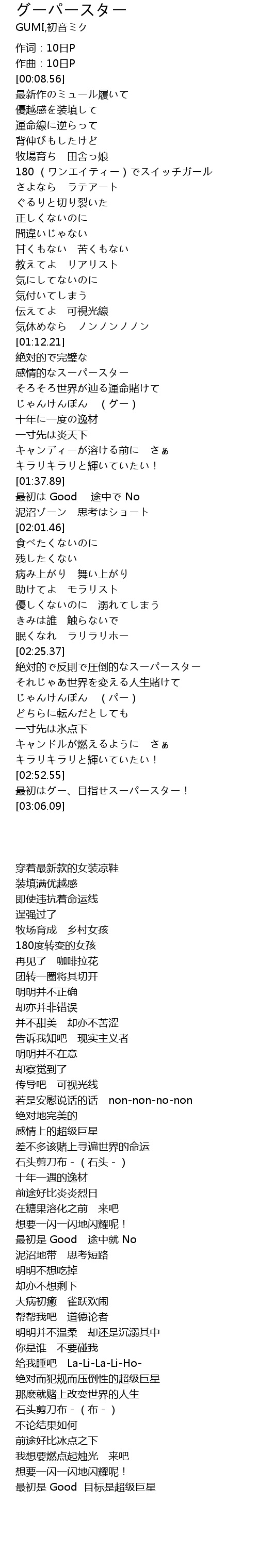 | [03:00.57] | 最初はグー、目指せスーパースター! |