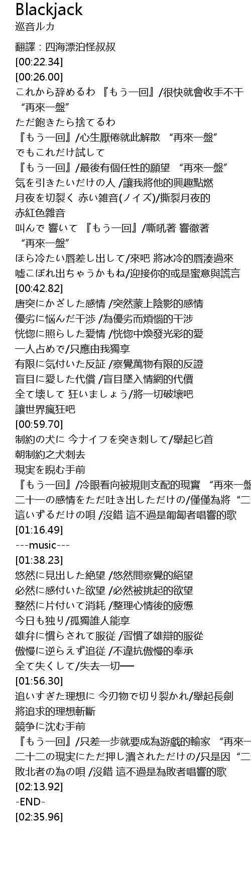 | [00:30.70] | でもこれだけ試して 『もう一回』/最後有個任性的願望 “再來一盤” |