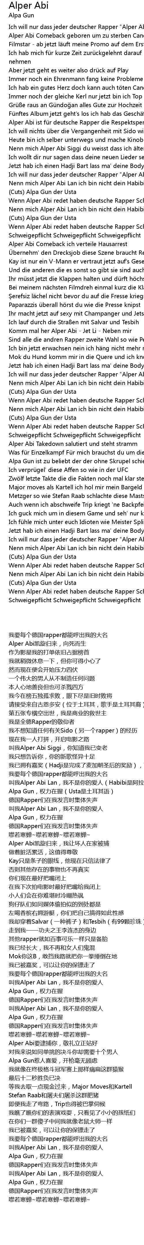 | [02:05.60] | Ich will nur dass jeder deutscher Rapper " Alper Abi" sagt |
