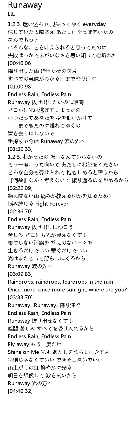 | [03:36.02] | Runaway...Runaway...降り注ぐ |