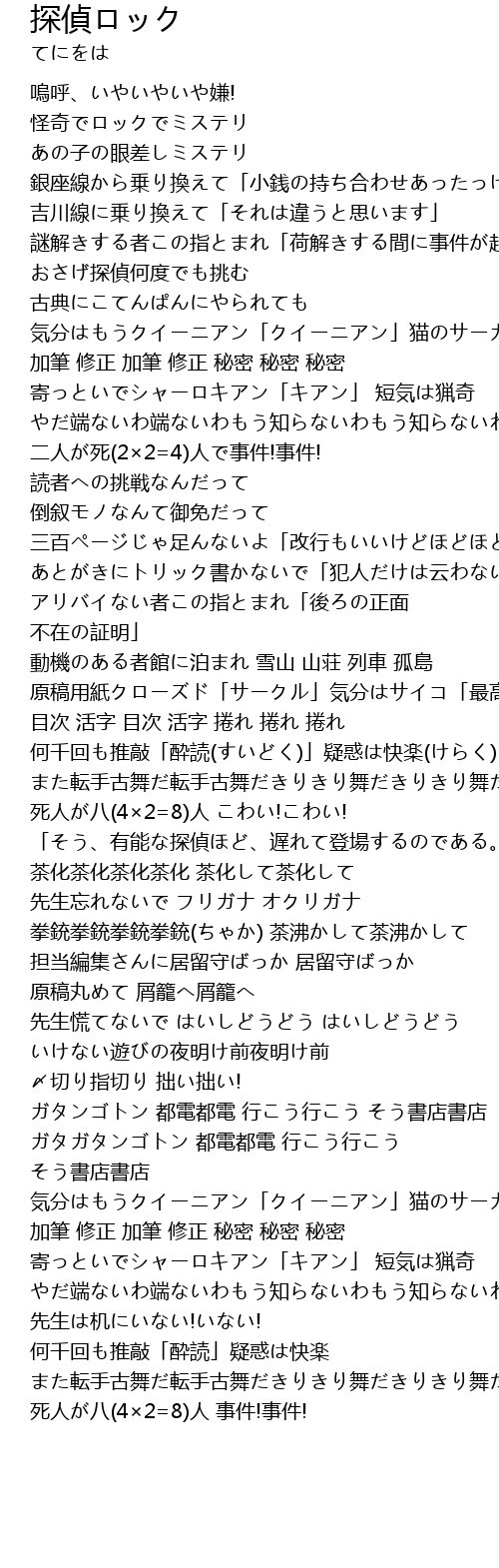 | [02:08.36] | 原稿用紙クローズド「サークル」気分はサイコ「最高!」 |