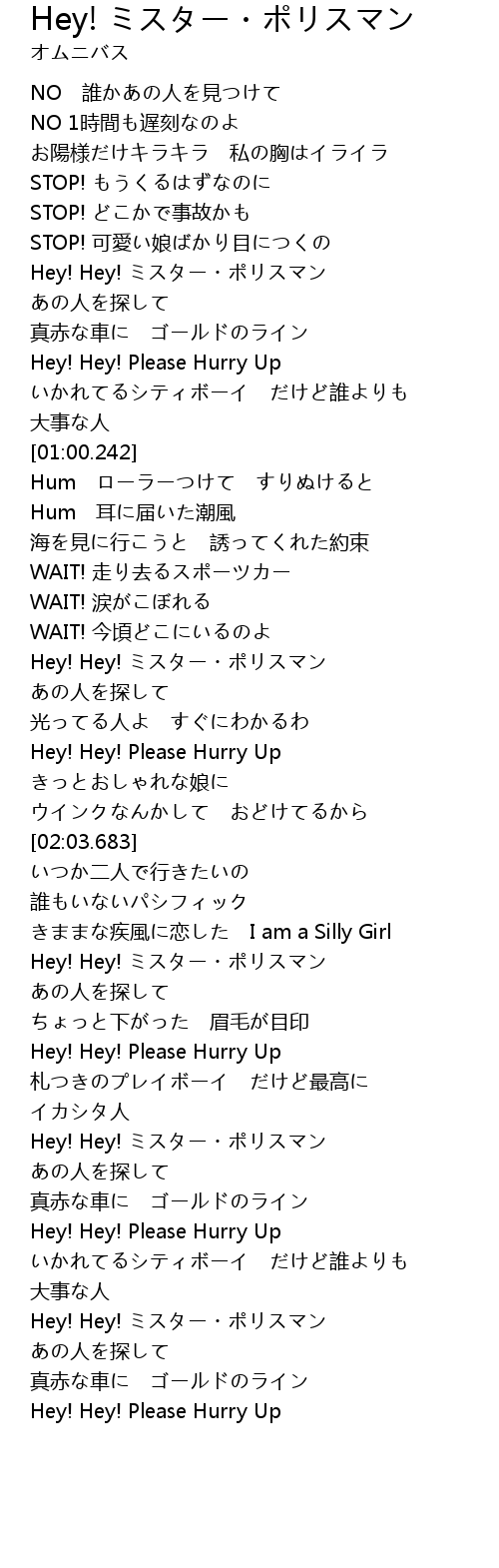 | [02:45.185] | Hey! Hey! ミスター・ポリスマン |