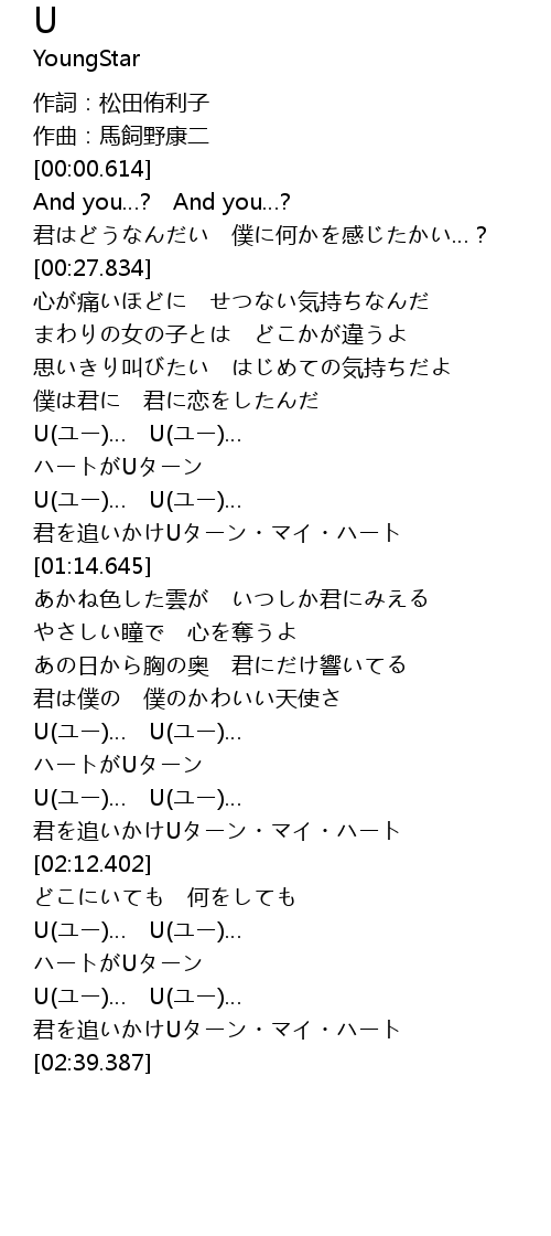 | [02:34.397] | 君を追いかけUターン・マイ・ハート |